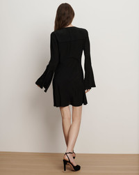 Product details A chic take on the LBD. Crafted from a lightweight crepe de chine, the Ezri dress features a mini, A-line silhouette with a V-shaped waist seam for a flattering fit. A pleated crew neckline, long, fluttering circle sleeves, and a front keyhole clasp complete the look. Style this black dress with a simple heel and clutch for your next dinner or date night. - 100% Viscose - Lining: 100% Polyester - Dry clean only - Style #2511CD2022376