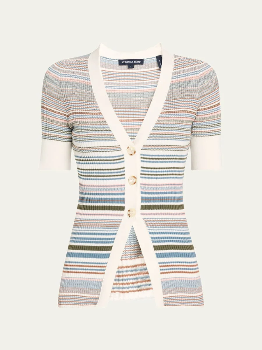 Veronica Beard "Fawne" striped cardigan in rib-knit V neckline Short sleeves Fitted silhouette Cut-away hem Button-front Cotton Dry clean Imported Online Inquiries: BGS21_T6RAJ| Store Inquiries: #5025179