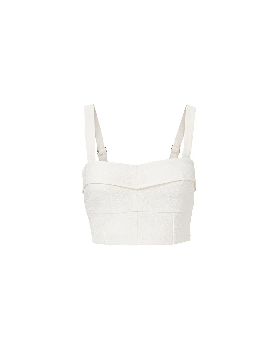 Product details An elevated take on the cropped tank, the Faxon is crafted from white woven jacquard with a tonal floral pattern. Fitted at the bodice, it features tonal piping and topstitching across the squared neckline and back, finished with a hidden side zipper and wide adjustable straps for ease. Dress it up with the coordinating Fellini skirt, or dress it down with high-rise denim. - 100% Polyester - Lining: 100% Polyester - Dry clean only - Style #2503JQ3841240
