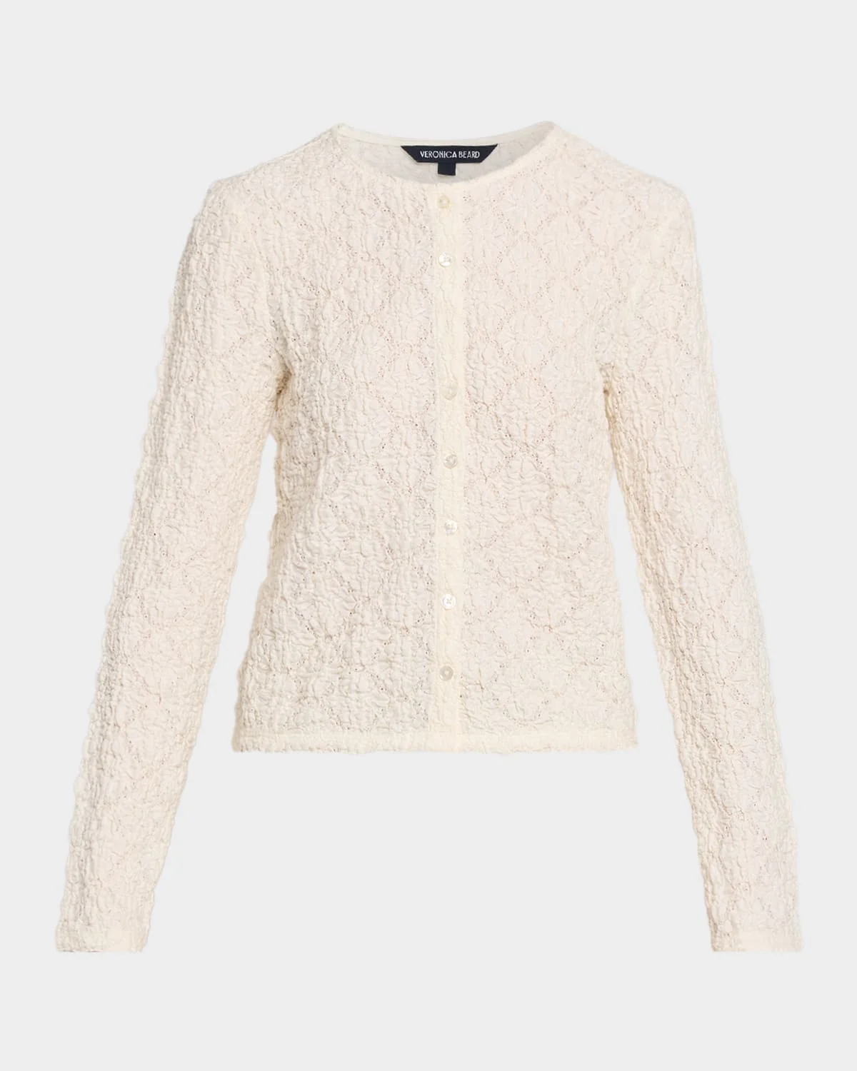 Veronica Beard "Gillingham" cardigan crafted from delicate stretch-lace Crew neckline Long sleeves Slim fit Hem sits at the hip Button-front & nbsp; Cotton/polyester Machine wash cold Imported SIZE & FITModel measurements: 5 & apos;10" tallModel is wearing a US size 4/Small