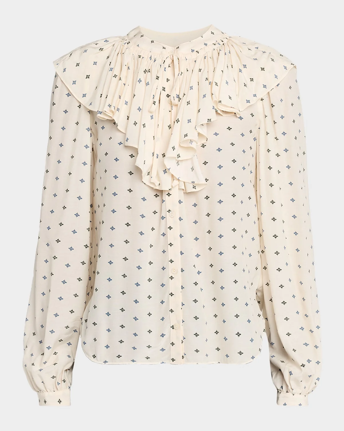 Veronica Beard "Gomez" printed blouse adorned with cascading ruffles that frame the yoke. High neckline with selftie Long sleeves with button cuffs; approx. 32.3"L Classic fit Hem falls to the hip Buttonfront Viscose Dry clean Imported