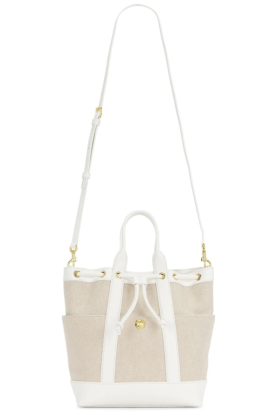 - Canvas exterior with leather trim and twill lining - Made in Vietnam - Top drawstring and magnetic button closure - One main compartment - Interior zipper pocket.4 exterior slip pockets - Integrated handles and detachable and adjustable leather shoulder strap - Measures approx 8.5" W x 9.75" H x 4" D Shoulder strap with a 21" drop Top handle with a 4.25" drop - Revolve Style No. VBRD-WY8 - Manufacturer Style No. H2502HCA01X011