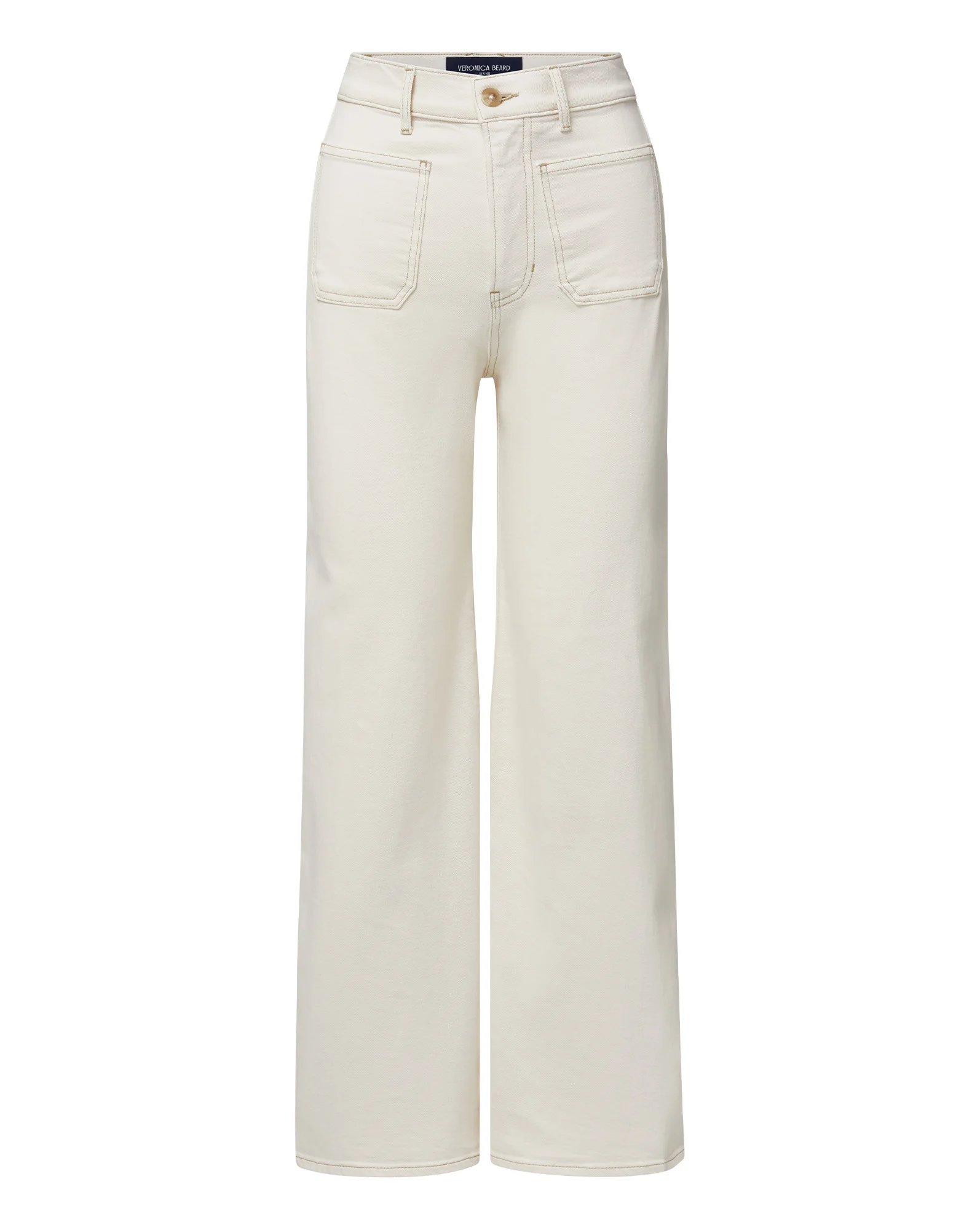 Product details Meet the Grant, our classic high-rise, wide-leg silhouette with an ankle crop. Made in LA from comfort-stretch Japanese denim it has the most flattering fit and a quick recovery. Finished with patch pockets and a horn button, it's easily dressed up or down. In summer-ready ecru, this pairs well with blazers and sandals for our tried-and-true VB uniform. - 98% Cotton, 2% Elastane - Made in USA from premium Italian denim - Closure: Button and fly zip - Turn inside out and machine wash cold. Hang to dry. Color transfer may occur. - Style #J2506D241068EC