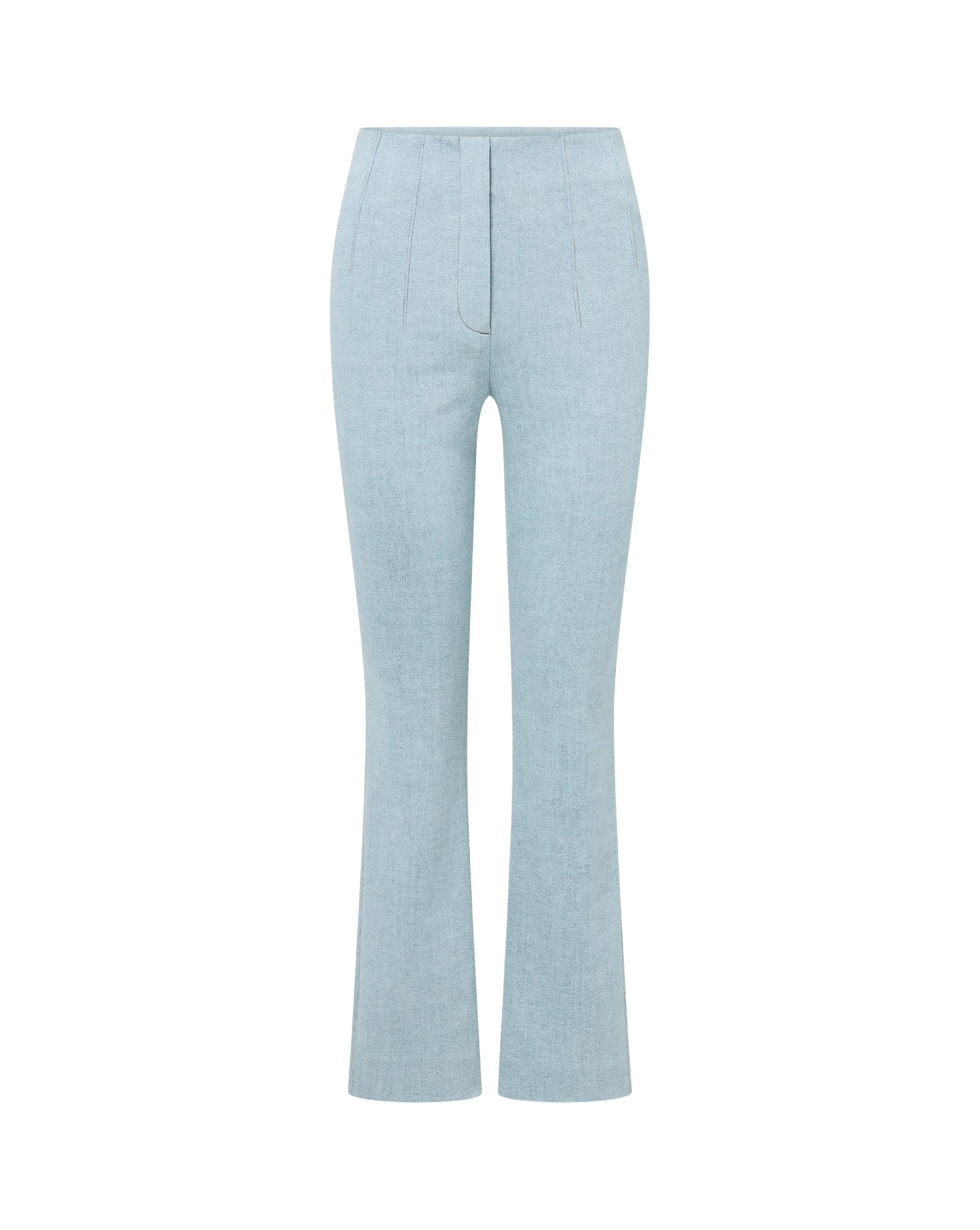 Product details Expertly tailored from premium stretch cotton denim, the light blue Hawthorne pant is defined by a cropped, high-waisted silhouette with a slim fit and a slightly flared hem. Consider this a polished take on classic kick-flare jeans—the clean, streamlined design provides a timeless anchor to pair with anything and everything, from work to weekend. - 98% Cotton, 2% Elastane - Closure: Front zip with a hook-and-bar closure - Dry clean only - Style #2507NV2360674