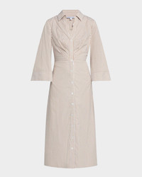 - Veronica Beard "Haydon" striped cotton midi dress enhanced with a gathered bodice - Point collar; V neckline - Three-quarter sleeves with button cuffs - Shirtdress silhouette - Hem falls below the knee - Button-front - Cotton - Dry clean - Imported