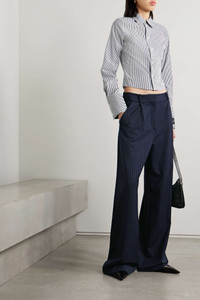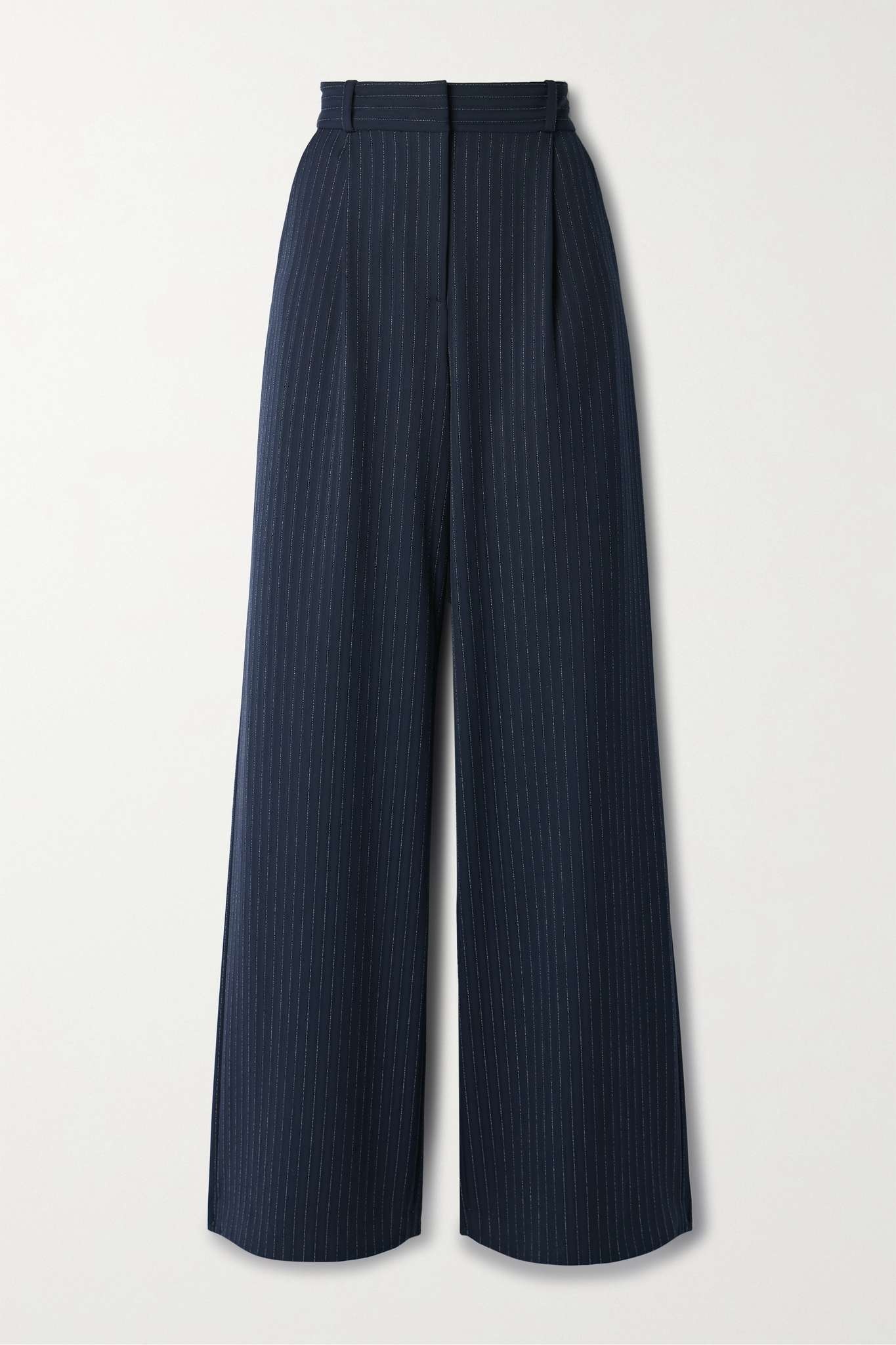 EDITORS'NOTES Veronica Beard's 'Heyser' pants are made from navy twill that's woven with subtle metallic pinstripes for an elongating effect and a touch of sparkle. They have soft pleats that enhance the wide legs and can either be worn at the waist or low on the hips, depending on your preference - just choose your size accordingly. Wear them with a collared shirt or chunky sweater. SIZE & FIT - Fits true to size, take your normal size - High-rise, cut for a wide-leg fit - Particularly long in length - Mid-weight, non-stretchy fabric - Model is 180cm/ 5’11” and is wearing a US 4 DETAILS & CARE - Navy and metallic twill - Concealed hook, button and zip fastening at front - 67% polyester, 29% viscose, 4% elastane