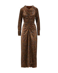Product details An evening-ready boho dress. Crafted from premium stretch silk with a rich brown paisley print, the Irma midi dress features a fluid, body-skimming silhouette with flattering center-front ruching. Shoulder fold accents and wide cuffed long sleeves complete the look. A chic choice for event dressing, just add heels and go. - 53% Silk, 35% Viscose, 12% Elastane - Lining: 100% Polyester - Dry clean only - Style #2511FL5621993