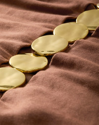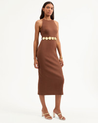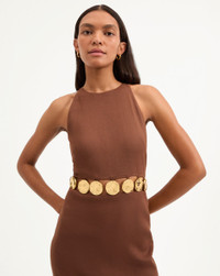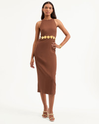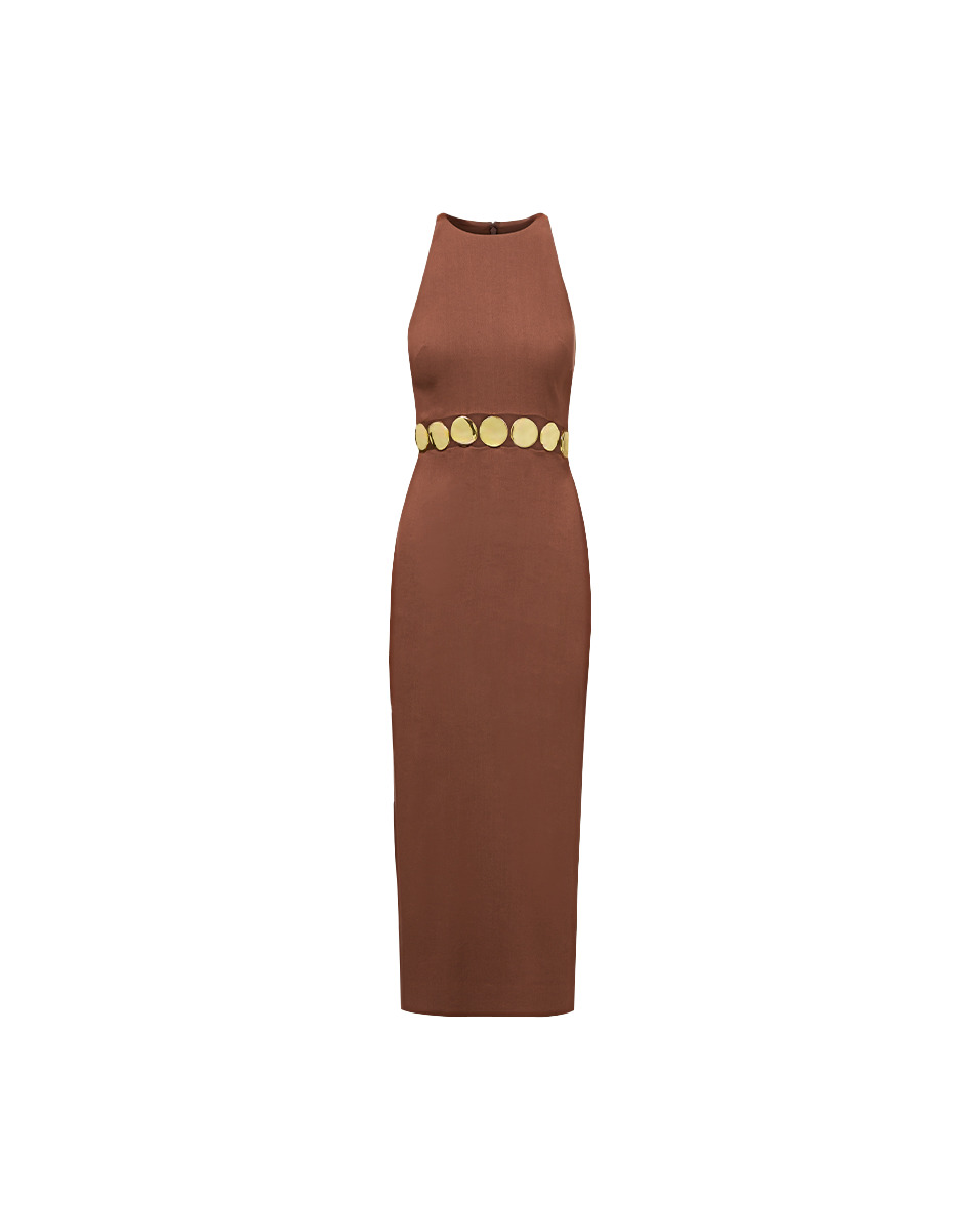 Product details A sheath dress, with a glamorous upgrade. Expertly tailored from Italian stretch linen, the brown Isla midi is a timeless closet hero. The streamlined silhouette, with a chic closed-back halter, boasts hammered gold medallions and peekaboo cutouts at the waistline for trompe l'oeil belt effect. Wear solo or layered under a blazer—or both ways for a stylish day-to-night quick-change. - 55% Linen, 44% Viscose, 1% Elastane - Lining: 100% Polyester - Fabric country of origin: Italy - Dry clean only - Style #2504LN3321486