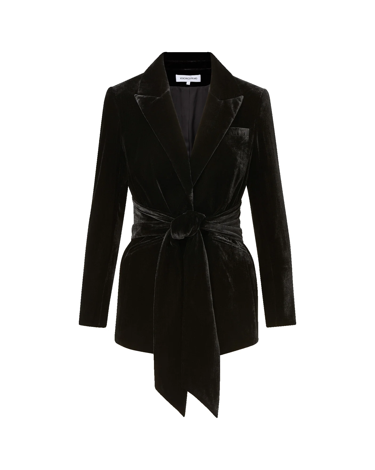 Product details An elevated twist on the classic blazer. Crafted from luxurious black velvet, the Issel jacket features a relaxed, elongated silhouette and a wrap-style tie to cinch and define the waist. A peak lapel, chest welt pocket, and self-covered buttons at the front and sleeves enhance its clean, streamlined appeal. Perfect for event dressing, it pairs with the coordinating Alex pants for a chic tailored set. - 75% Rayon, 25% Polyamide - Lining: 96% Polyester, 4% Elastane - Dry clean only - Style #2510VL1511322