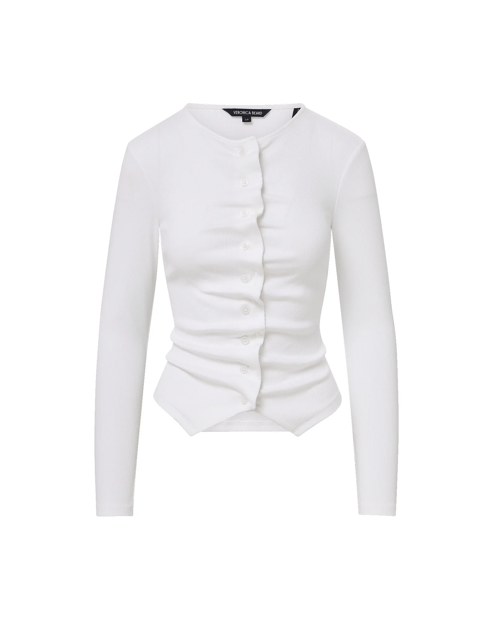 Product details The classic long-sleeve tee—with a feminine twist. Crafted from white stretch cotton, the Jasminah top features a button-front silhouette that’s intentionally ruched to create an accordion-like effect, adding texture and depth. Long sleeves and a split hem complete the design. Perfect for elevating any day look—style with VB denim for off-duty polish or with wide-leg trousers for the office. - 96% Cotton, 4% Elastane - Machine wash cold. - Style #J2511JY15270619