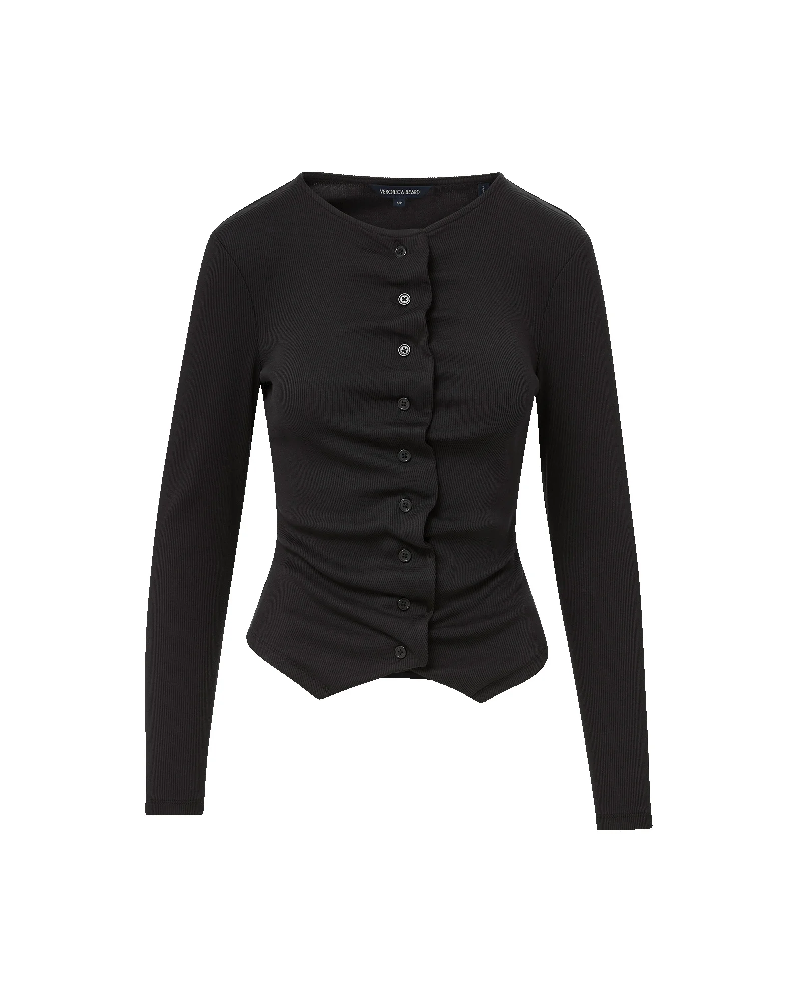 Product details The classic long-sleeve tee—with a feminine twist. Crafted from black stretch cotton, the Jasminah top features a button-front silhouette that’s intentionally ruched to create an accordion-like effect, adding texture and depth. Long sleeves and a split hem complete the design. Perfect for elevating any day look—style with VB denim for off-duty polish or with wide-leg trousers for the office. - 96% Cotton, 4% Elastane - Machine wash cold. - Style #J2511JY152T0619