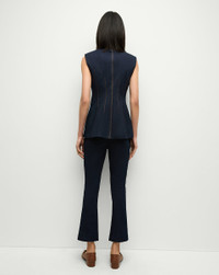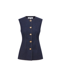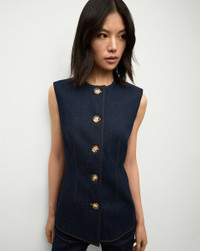 Product details A denim vest, with polish. Expertly tailored from premium stretch cotton, the jewel-neck Jessup is fitted at the waist and falls to a slight flare. Contrast-color topstitching and tortoiseshell buttons complete the look. Pair with the Tani pant for a sophisticated take on double denim. - 75% Cotton, 23% Polyester, 2% Elastane - Lining: 100% Polyester - Dry clean only - Style #2412NV2610891
