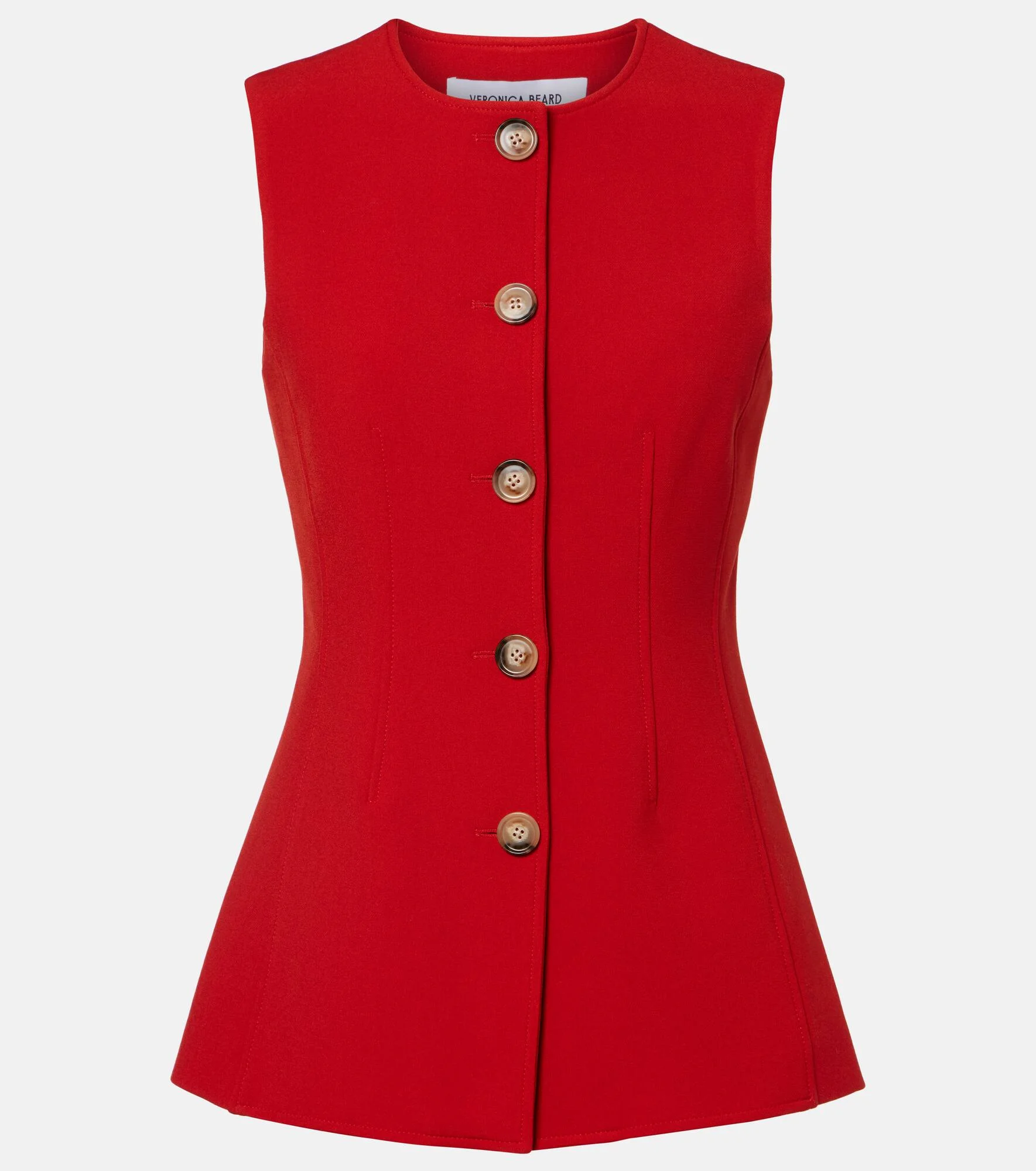 Veronica Beard's low-effort, high-impact separates find the perfect balance between casual and chic. The Jessup vest is a tailored piece with a gently flared silhouette. Product Details - Material: 63% polyester, 27% viscose, 7% cotton, 3% elastane - Care instructions: dry clean - Made in the USA - Color: red - Designer color name: Carnelian Red - Lining: 100% polyester - Closure: buttoned front - Item number: P01142622 Size & Fit - True to size - Cinched waist - Non-stretchy fabric - Falls below the hip - The model seen in the picture is 178cm-5'10" and wearing a size US 4