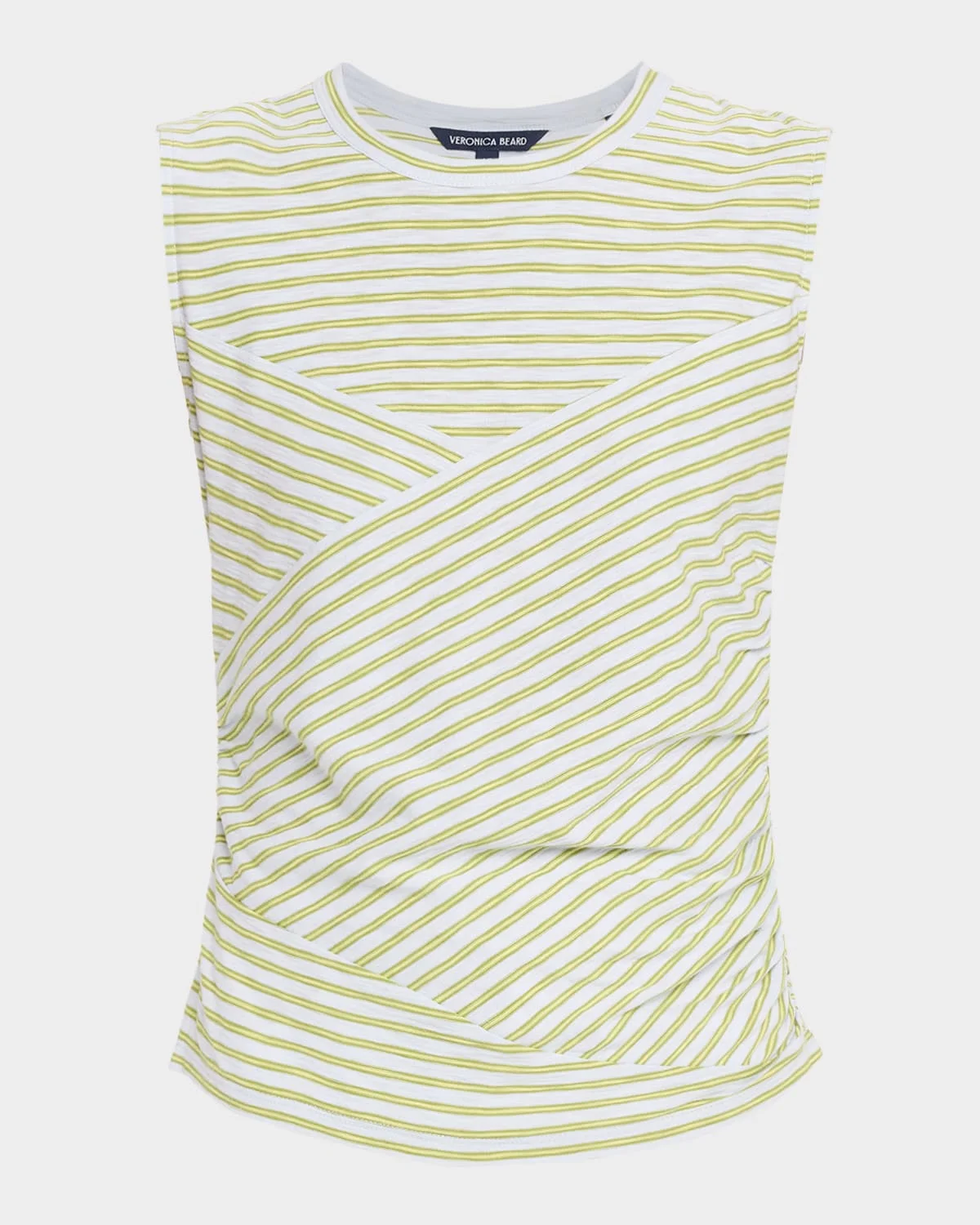 Veronica Beard "Johana" ruched cotton tee detailed with a stripe motif that crisscrosses the silhouette Crew neckline Sleeveless Classic fit Hem sits at the hip Pullover style & nbsp; Cotton Machine wash cold Made in Peru SIZE & FITModel measurements: 5 & apos;10" tallModel is wearing a US size 4/Small