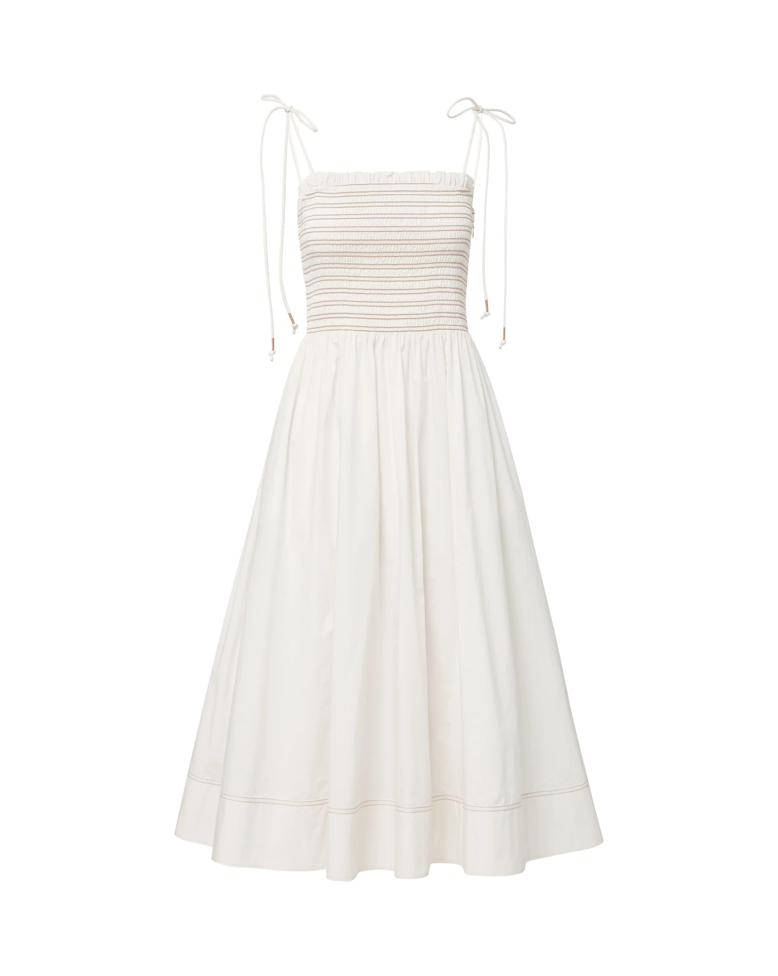 Product details The summer sundress, perfected. Crafted from soft cotton poplin in summery off-white, this smocked midi dress features a ruched, elasticated bodice for a curve-hugging fit, opening into a full, breezy circle skirt. Contrast stitching, adjustable straps, and ruffled top trimming complete the look. Exuding day-to-night ease, the versatile length pairs well with flat and heeled sandals alike. - Details: 100% Cotton - Lining: 100% Cotton - Dry clean only - Style #2506CO18221574