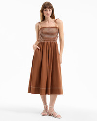 Product details The summer sundress, perfected. Crafted from soft cotton poplin in summery off-white, this smocked midi dress features a ruched, elasticated bodice for a curve-hugging fit, opening into a full, breezy circle skirt. Contrast stitching, adjustable straps, and ruffled top trimming complete the look. Exuding day-to-night ease, the versatile length pairs well with flat and heeled sandals alike. - Details: 100% Cotton - Lining: 100% Cotton - Dry clean only - Style #2506CO18221574