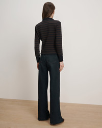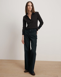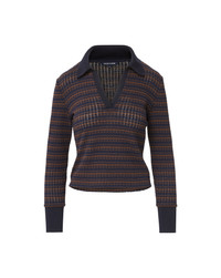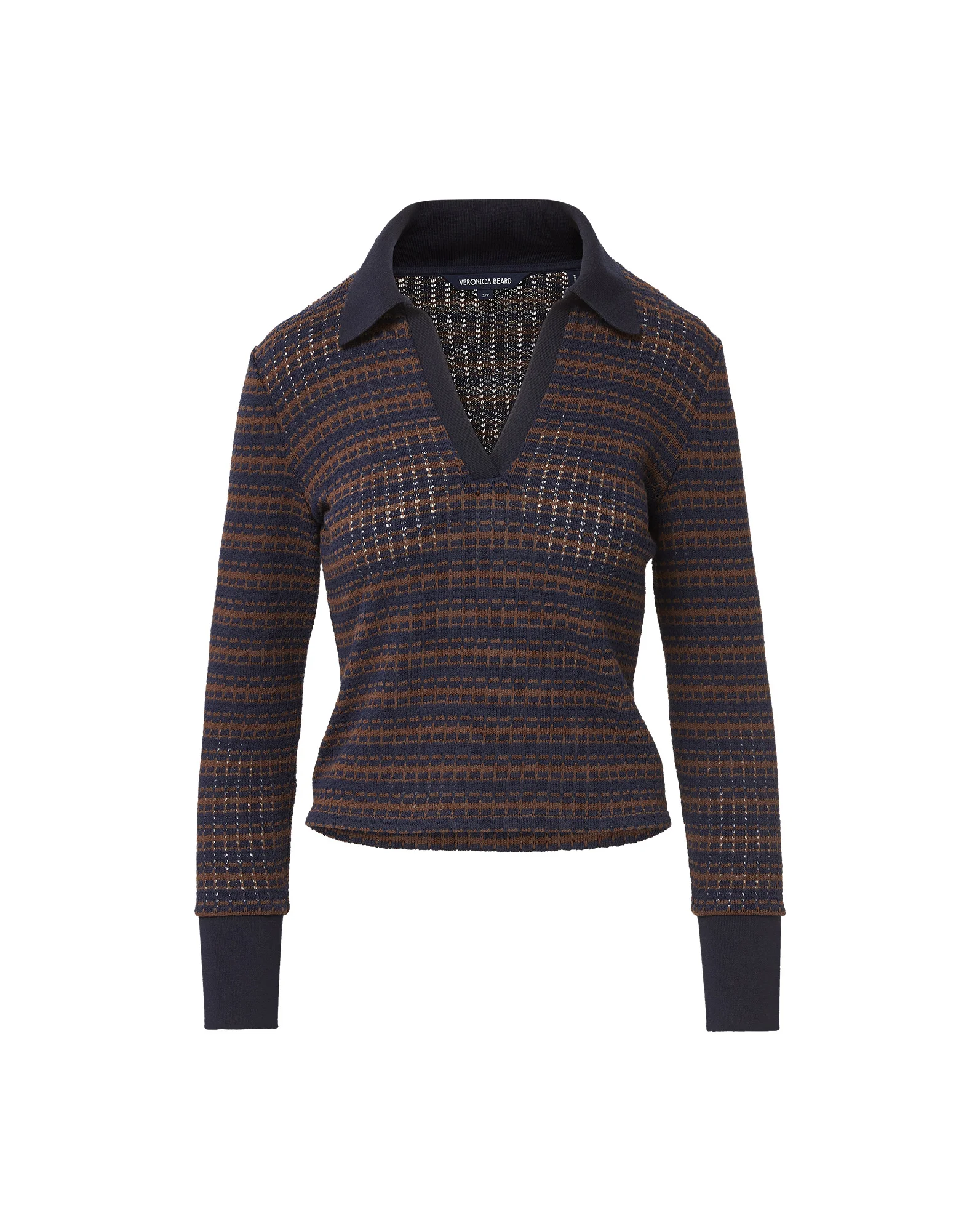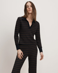 Product details The polo, perfected. The Kamal is crafted from a rich navy-and-brown striped knit in a long-sleeved polo silhouette. Solid navy cuffs and a Johnny collar add dimension to this easy wardrobe staple. Pair with the coordinating Yadira pant for off-duty chic, or style with tailored trousers for polished ease. - 80% Polyester, 20% Cotton - Dry clean only - Style #J2509JY188T0556