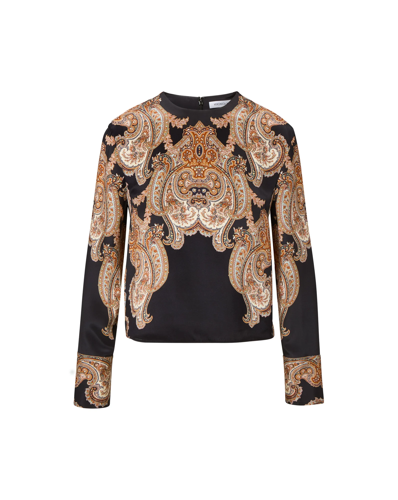 Product details A bold take on the paisley blouse. Crafted from a luxe silk blend, Karisse is a long-sleeve, crewneck top with a relaxed, straight fit, defined by a graphic beige paisley motif and wide sleeve cuffs. Boho without the frills, it can be dressed up or down with ease: pair with denim, tailored trousers, or a chic little mini skirt. - 58% Silk, 42% Viscose - Lining: 100% Polyester - Dry clean only - Style #2508GG7341395