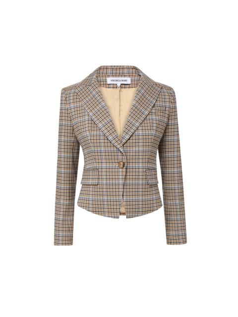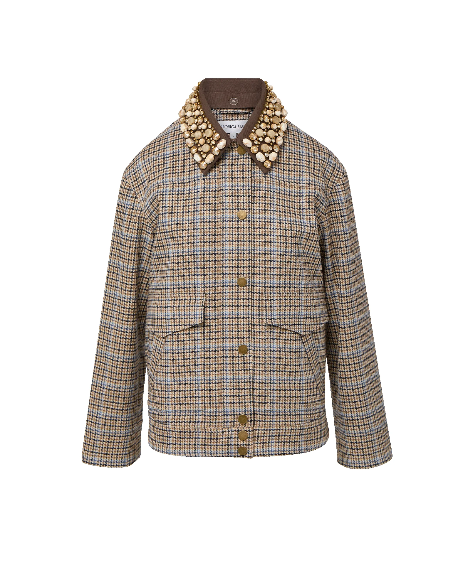 Product details A preppy take on the chore coat, the Kasper jacket is crafted from a stretch tailoring blend in a brown-and-blue tri-color plaid. Cut in a wide, boxy silhouette, it features a full snap-button placket for easy on-and-off wear. The removable embellished collar—detailed with varying crystals and stones—adds a touch of glamour and offers styling versatility. Finished with double flap pockets and fluted sleeves, it brings a soft, feminine edge to a utilitarian shape. Pair with dark-wash denim and heeled boots for a polished look. - 64% Polyester, 34% Viscose, 2% Elastane - Lining: 100% Viscose - Made in USA - Dry clean only - Style #2602PL10411881