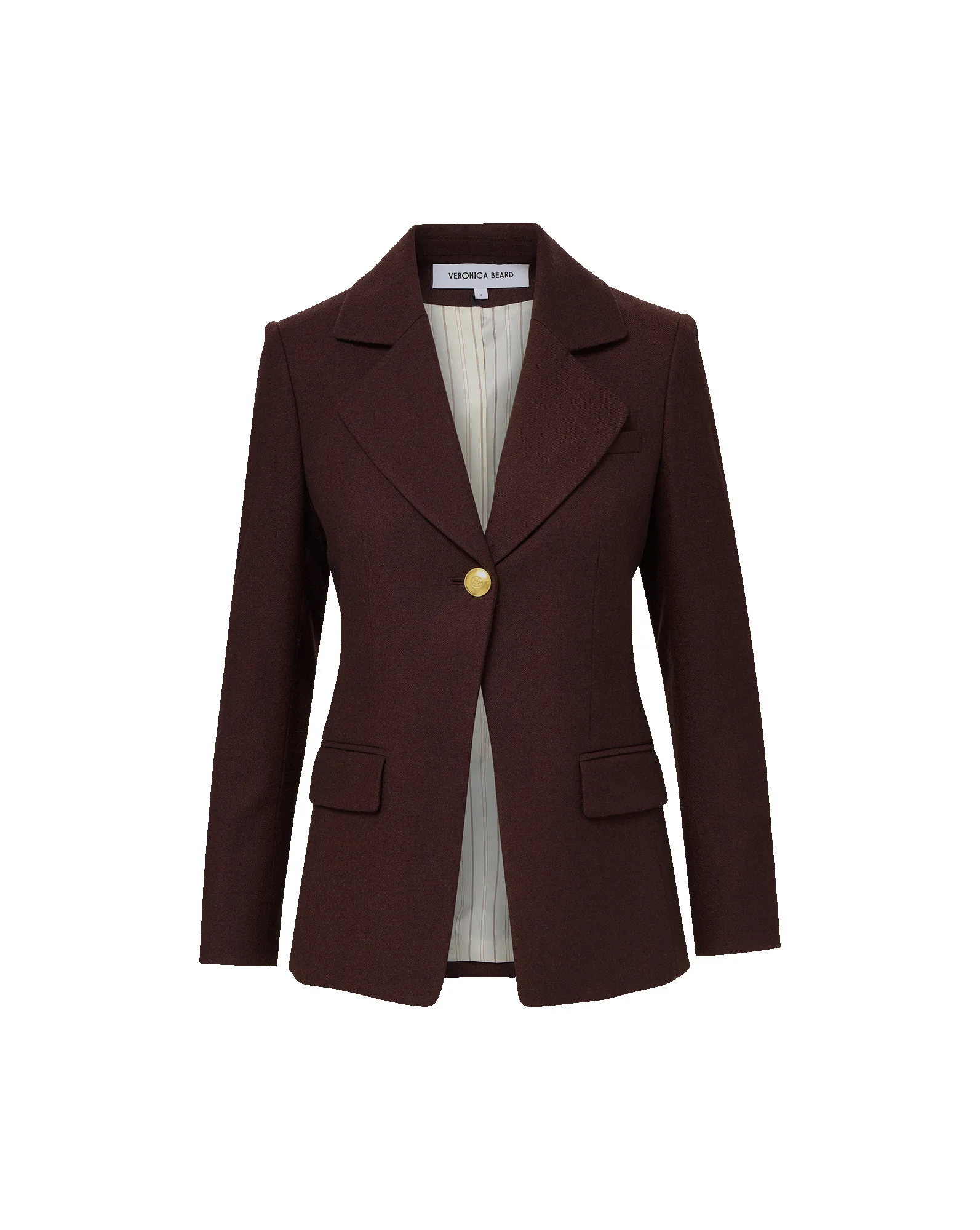 Product details Crafted from a lightweight wool blend in burgundy, the Kessler jacket is expertly tailored for a slim, flattering fit. Side darting and thoughtfully placed flap pockets enhance the shape, while an exaggerated notch lapel adds a subtle vintage touch. Gold buttons at the single-breasted closure and cuffs complete the look. Pair with trousers for the office or jeans for more laid-back moments—then add your favorite dickey to switch up your look. - 34% Polyester, 33% Viscose, 32% Wool, 1% Elastane - Linings: 100% Polyester, 95% Polyester, 5% Elastane - Made in the USA - Dry clean only - Style #2510SU7311320