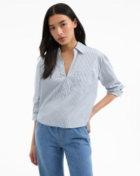 Product details Endlessly versatile, the Khai shirt is the striped top every woman needs—perfect on its own or as a layering essential. Expertly tailored from lightweight stretch cotton, this billowy, relaxed silhouette—in chic blue and white—is finished with a neat collar, a split V-neck, and a single patch pocket. Throw it on over jeans, skirts, shorts, you name it. - 84% Cotton, 12% Polyamide, 4% Elastane - Unlined - Dry clean only - Style #2505PO5640714
