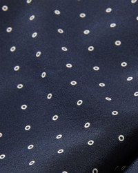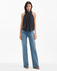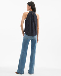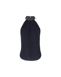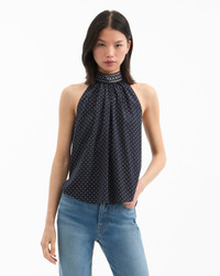 Product details Expertly made from premium stretch silk, the Kovi halter top features a beautiful drape, navy and white polka dots, and a decorative trim of trompe l'oeil chain-links at the neck. Pair with jeans and stilettos for a night out or, for an elegant matching set, wear with the coordinating Hartley skirt. - 93% Silk, 7% Elastane - Unlined - Closure: Keyhole back with double-button closure - Dry clean only - Style #2507SDC0340852