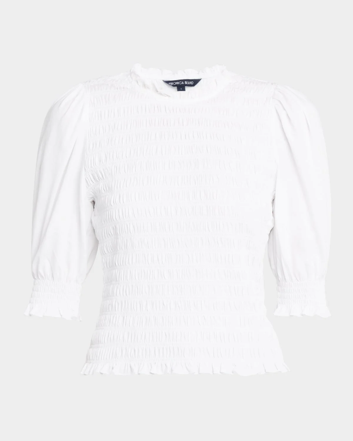 Veronica Beard Jeans "Langston" smocked top with short puffed sleeves Crew neckline Fitted silhouette Hem sits at the hip Pullover style Cotton Machine wash cold Imported