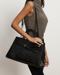Product details A roomier version of the original's sculptural shape, the aptly named Dash is a go-anywhere bag that takes you from work to weekends. Crafted from black croc-embossed leather with an adjustable belted strap, it's designed with both a structured top handle and a removable shoulder strap for maximum versatility. An interior zip pocket and magnetic closure add everyday ease. - 100% Leather - Lining: 100% Polyester - 16.9” L x 6.3” W x 10.2” H - Handle Drop: 4.7" | Strap Drop: 21.7" - Store in a cool, dry place and wipe any surface dirt with a dry cloth - Style #H2510HL115Z055