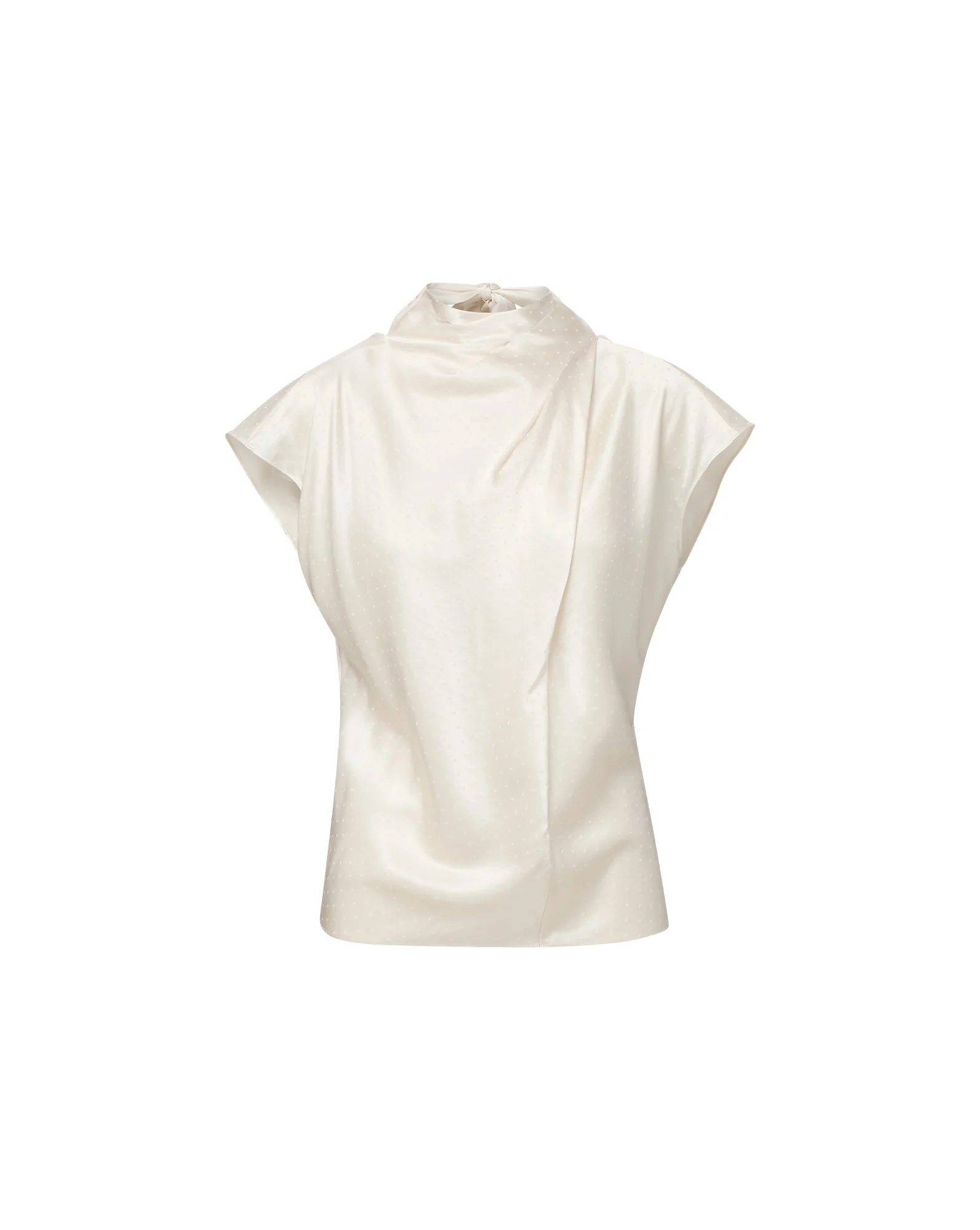 Product details Crafted from premium stretch silk, the Leilany puts thoughtful construction in the spotlight with asymmetrical gathered details that fall to a beautiful drape. A tie-back neckline and subtle mini dot pattern complete the look. Equal parts elegant and effortless, this cap-sleeve top pairs perfectly with jeans, leather pants, and bias-cut maxi skirts. - 52% Silk, 40% Viscose, 8% Elastane - Dry clean only - Style #2508JQ4640909