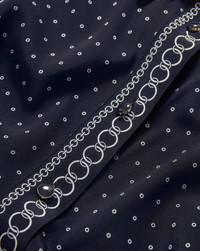 Product details The shirtdress, reimagined. Expertly tailored from premium stretch silk, the Lex dress is an elegant take on the wardrobe classic. The midi style features ruching on the sides, a beautiful drape, and a decorative trim of trompe l'oeil chain-links against navy and white polka dots. Dress it up or down, wear it day or night, with flats or heels. Pro tip: Leave a few buttons undone at the bottom for a sexy front-slit effect. - 93% Silk, 7% Elastane - Unlined - Closure: Button-down placket with a hidden zipper and a hook-and-eye closure. - Dry clean only - Style #2507SDC0321065