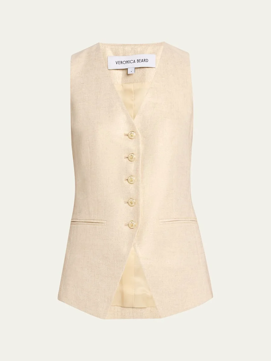 Veronica Beard "Liff" linen vest featuring a metallic sheen V neckline Sleeveless Adjustable back strap Hip welt pockets Tailored fit Cut-away hem Button-front Linen Dry clean Imported Size Note: Item runs large, consider ordering a size down. Online Inquiries: BGS21_T8ZC5| Store Inquiries: #4952315