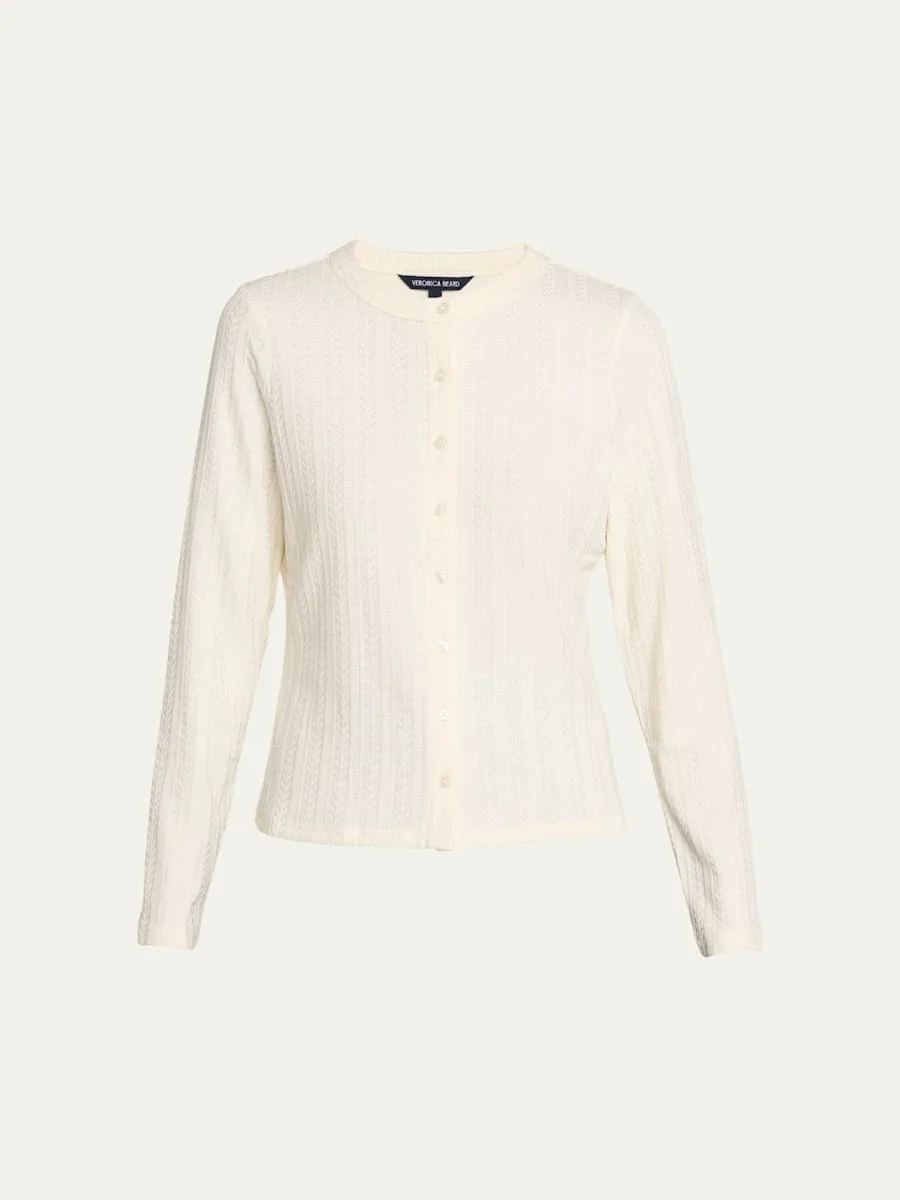 Veronica Beard "Lira" pointelle knit cardigan crafted from premium stretch knit Crew neckline Long sleeves; approx. 31"L Classic fit Hem sits at the hip Buttonfront Polyester Unlined Hand wash cold Imported