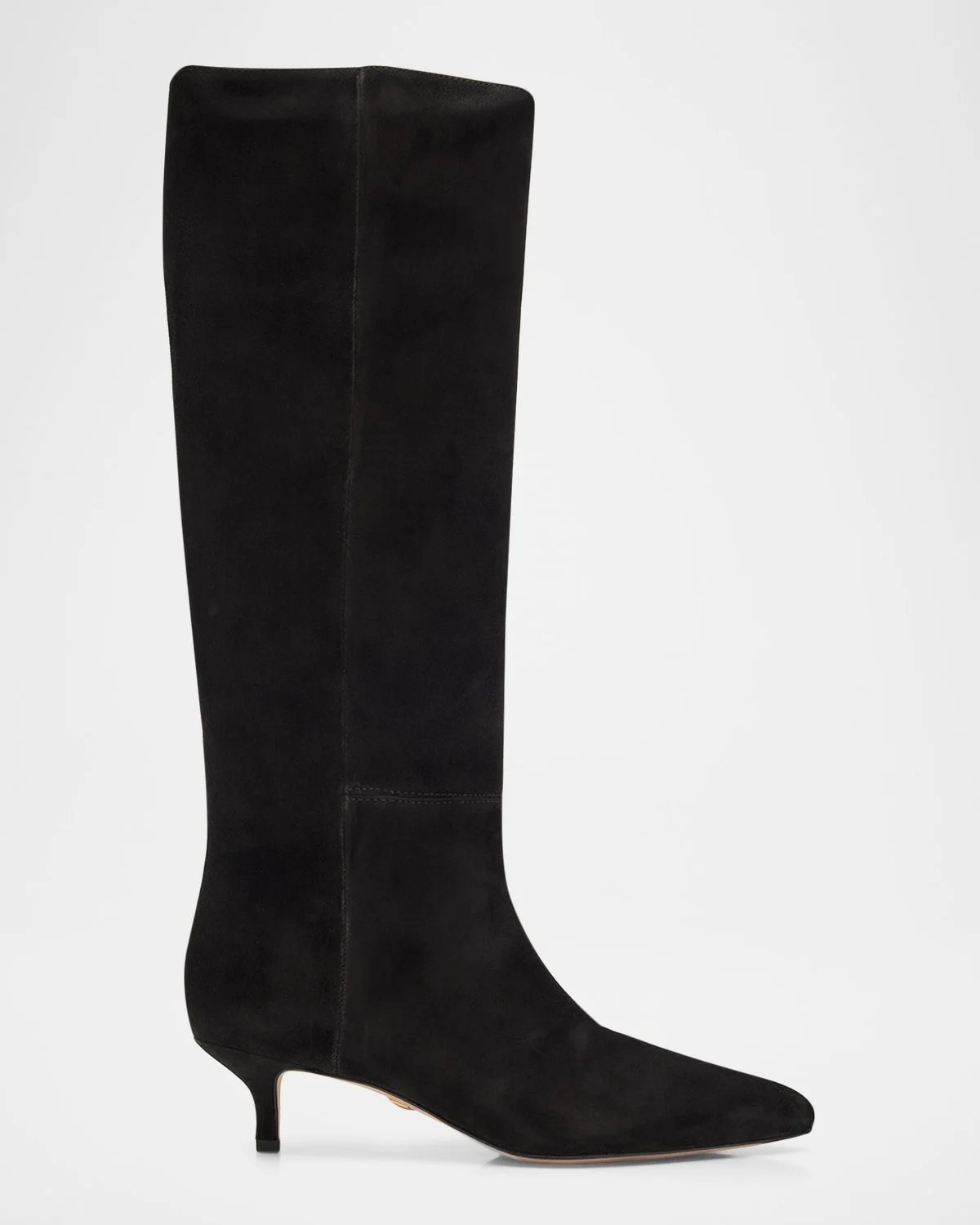 Veronica Beard "Lisa" knee boots are crafted from calfskin suede Kitten heel Pointed toe Slipon style Professional cleaning recommended Made in Italy