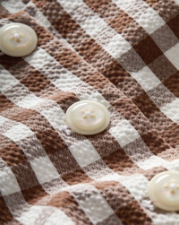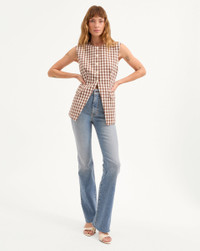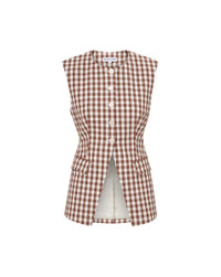 Product details A fashion-forward take on the vest—in summer-ready gingham. Expertly tailored from premium cotton seersucker—with stretch for ease—the brown and white Lois vest is defined by an exaggerated cutaway hem. With a clean, slim silhouette and darting at the bodice for waist definition, this style is great on its own or as a top layer. Pair with the matching patterned shorts for a chic set. - 98% Cotton, 2% Elastane - Lining: 100% Viscose - Made in USA - Dry clean only - Style #2504CO17411166