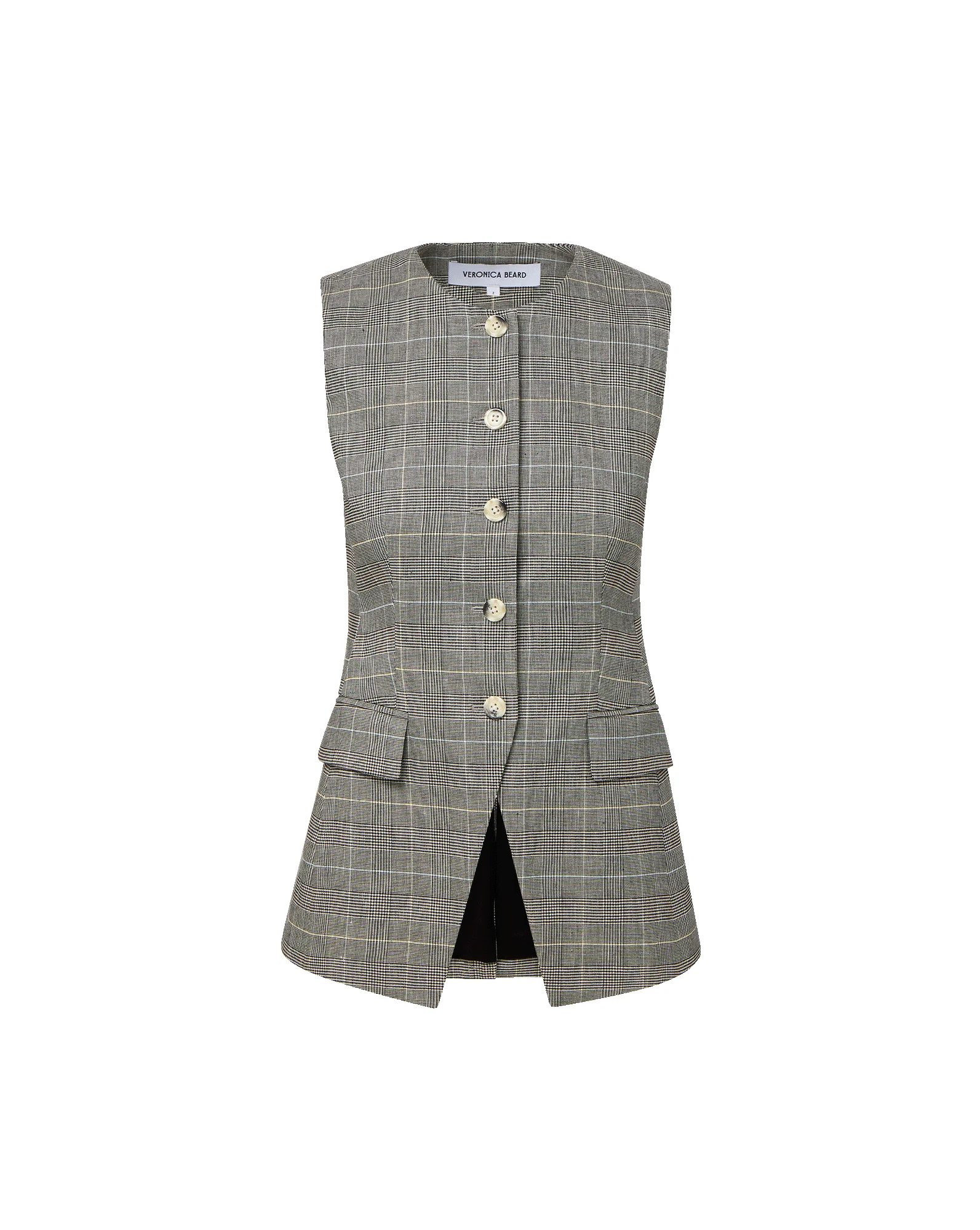 Product details A sophisticated take on the vest. The Lois sleeveless top is expertly tailored from Italian stretch linen, in black-and-white glen plaid. It features an elongated silhouette, a cutaway hem, and darting on the bodice for waist definition. Pair with jeans or the coordinating Jude pant for a warm-weather spin on power suiting. - 59% Linen, 39% Viscose, 2% Elastane - Lining: 95% Polyester, 5% Elastane - Fabric country of origin: Italy - Dry clean only, with buttons covered - Style #2602PL8211166
