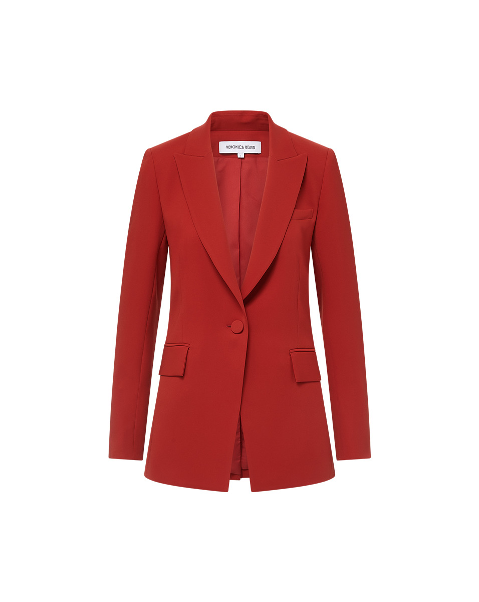 Product details A VB best-seller, now updated in vibrant red. Expertly tailored in the US, this single-breasted style features an elongated body and a cutaway silhouette. It's perfect for dressing up a pair of jeans and even chicer at night—just wear with the coordinating pants for a memorable matching set. - 65% Triacetate, 35% Polyester - Lining: 100% Polyester - Made in USA - Dry clean only - Style #2410CP211090