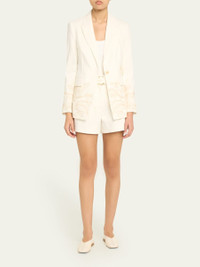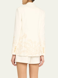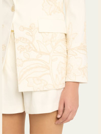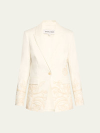 Veronica Beard "Long and Lean" embroidered dickey jacket Compatible with Veronica Beard dickey's (sold separately) Peak lapels Single-breasted front Long sleeves with button cuffs Chest welt pocket Hip flap pockets Tailored fit Cut-away hem Single button-front Linen Dry clean Imported Online Inquiries: BGS21_T8ZBZ| Store Inquiries: #4952304