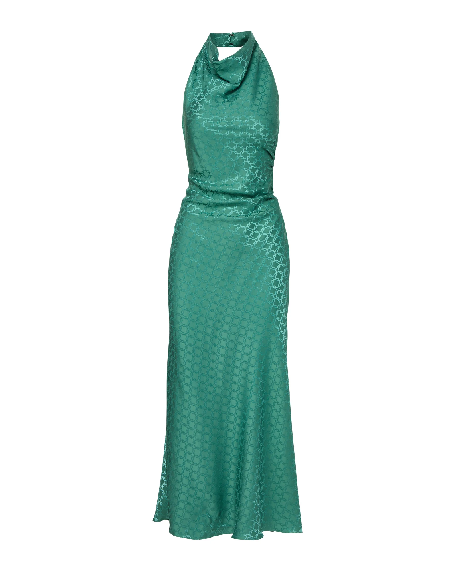 Product details Effortless elegance. Made from high-shine stretch silk in vibrant green, the Maggie halter dress features a draped cowl neck and side ruching for a flattering fit. A low, open back and maxi hemline add drama, while a subtle tonal chain pattern enhances its luxe appeal. Pair with nude heels and statement jewelry. - 74% Viscose, 26% Silk - Unlined - Dry clean only - Style #2505JQ1621707