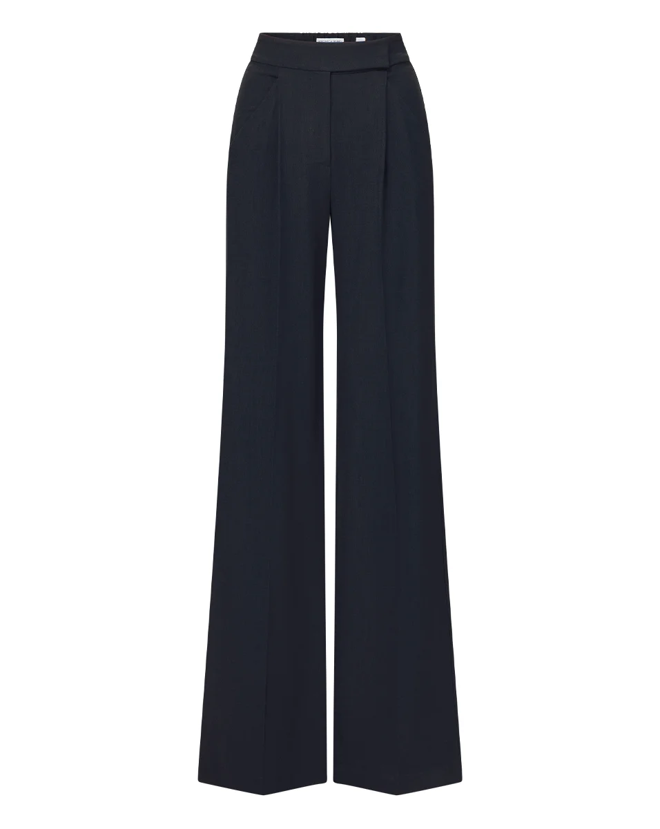 A relaxed, roomy pant that still feels superbly polished. Meet the Marbeau trousers in navy, a high-waisted, wide-leg silhouette with a fluid drape. Expertly tailored from a premium stretch blend, it's this pleated pant is finished with diagonal slip pockets. Dress it down with a white tee or pair with a navy blazer for an effortless pantsuit. - 98% Viscose, 2% Elastane - Lining: 100% Polyester - Made in USA - Dry clean only - Style #2602SU01860291