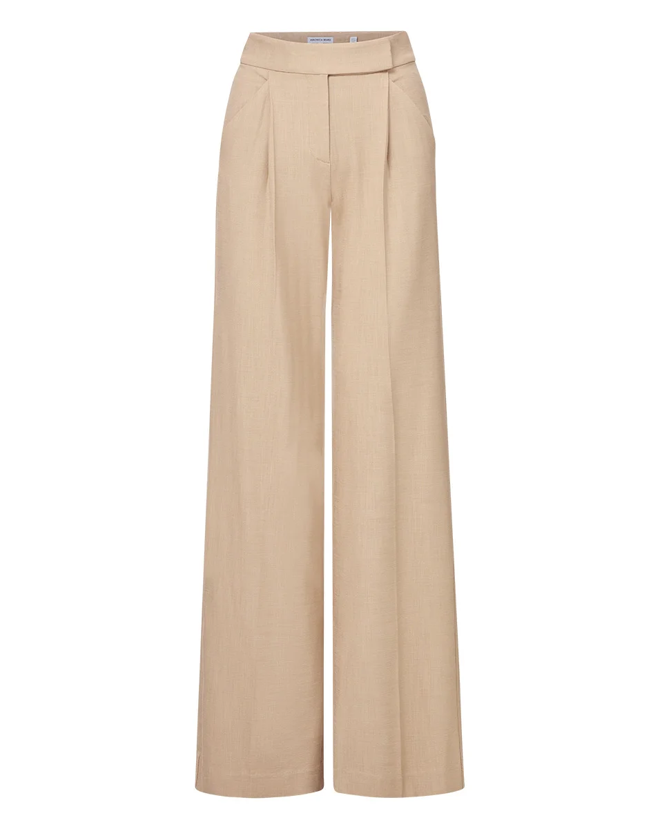 Product details The perfect relaxed pant. Made from a premium stretch blend, the high-waisted Marbeau is defined by a relaxed, wide-leg silhouette with front pleats for ease of movement. Belt loops and back welt pockets complete the look. In light khaki, they're great for work and off-duty moments too. - 98% Viscose, 2% Elastane - Lining: 100% Polyester - Made in USA - Dry Clean Only - Style #2502SU01860291