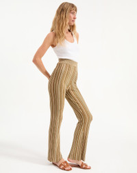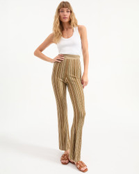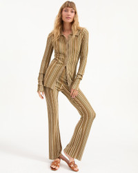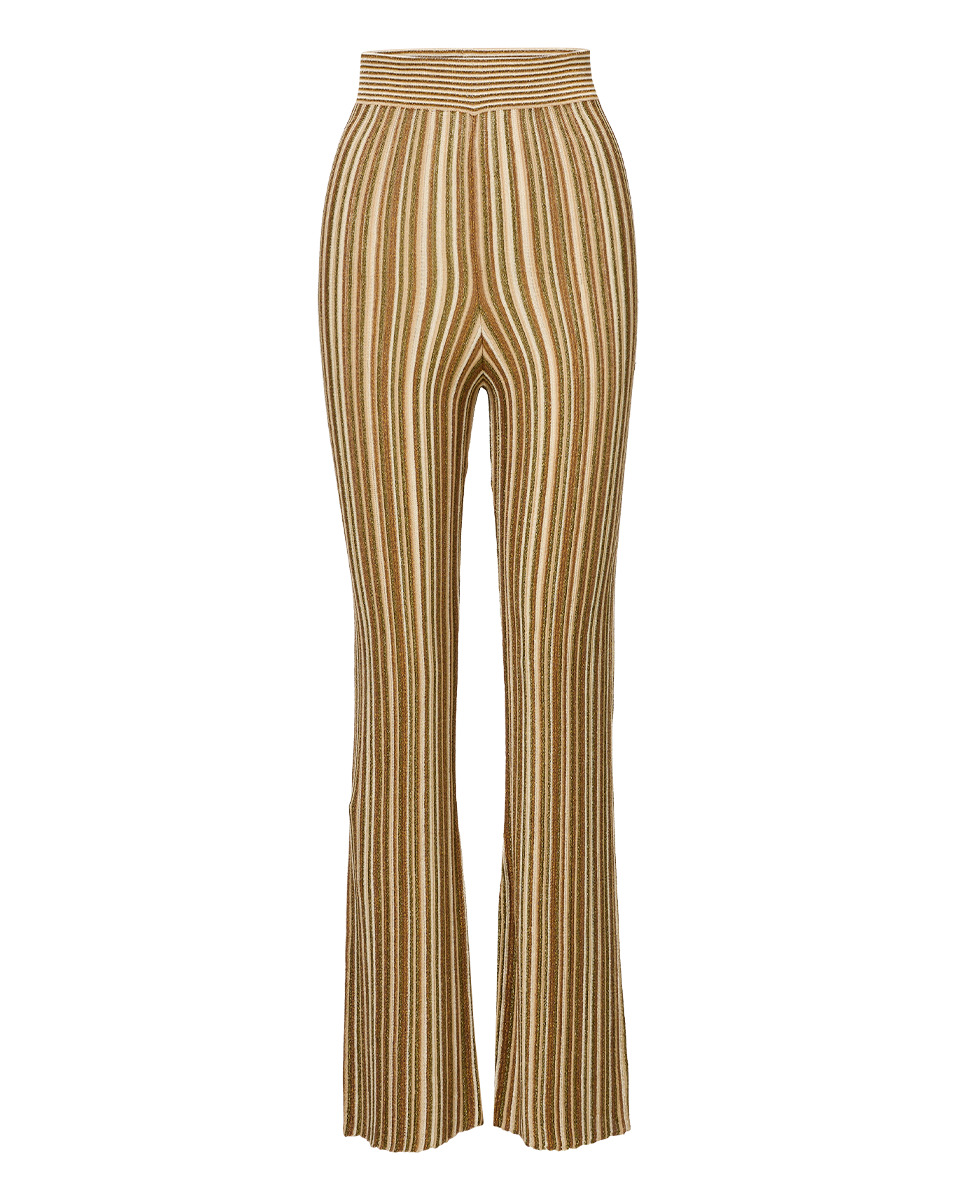 Product details The ease of sweats in a going-out pant. Spun from an Italian stretch blend, this high-waisted, wide-leg pant is fitted through the hips and thighs and features thin multicolor stripes, flecked with metallic bronze and gold. Pair with the matching Landon cardigan for a chic matching set. - 83% Viscose, 17% Metallic Fiber - Unlined - Fabric country of origin: Italy - Dry Clean Only - Style #2502KS4260445