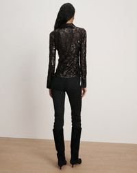 Product details A certified showstopper. The Matty button-down is adorned in all-over maroon sequins, designed to catch the light and command attention. Featuring a clean black trim and collar, its half-placket stops at the waist before opening into a split hem. Cuffed long sleeves finish the look, adding a tailored touch. Dress it down with black pants—or go full glam with the matching sequin trousers. - 94% Polyester, 6% Elastane - Lining: 100% Polyester - Spot clean only - Style #2509EM9141359
