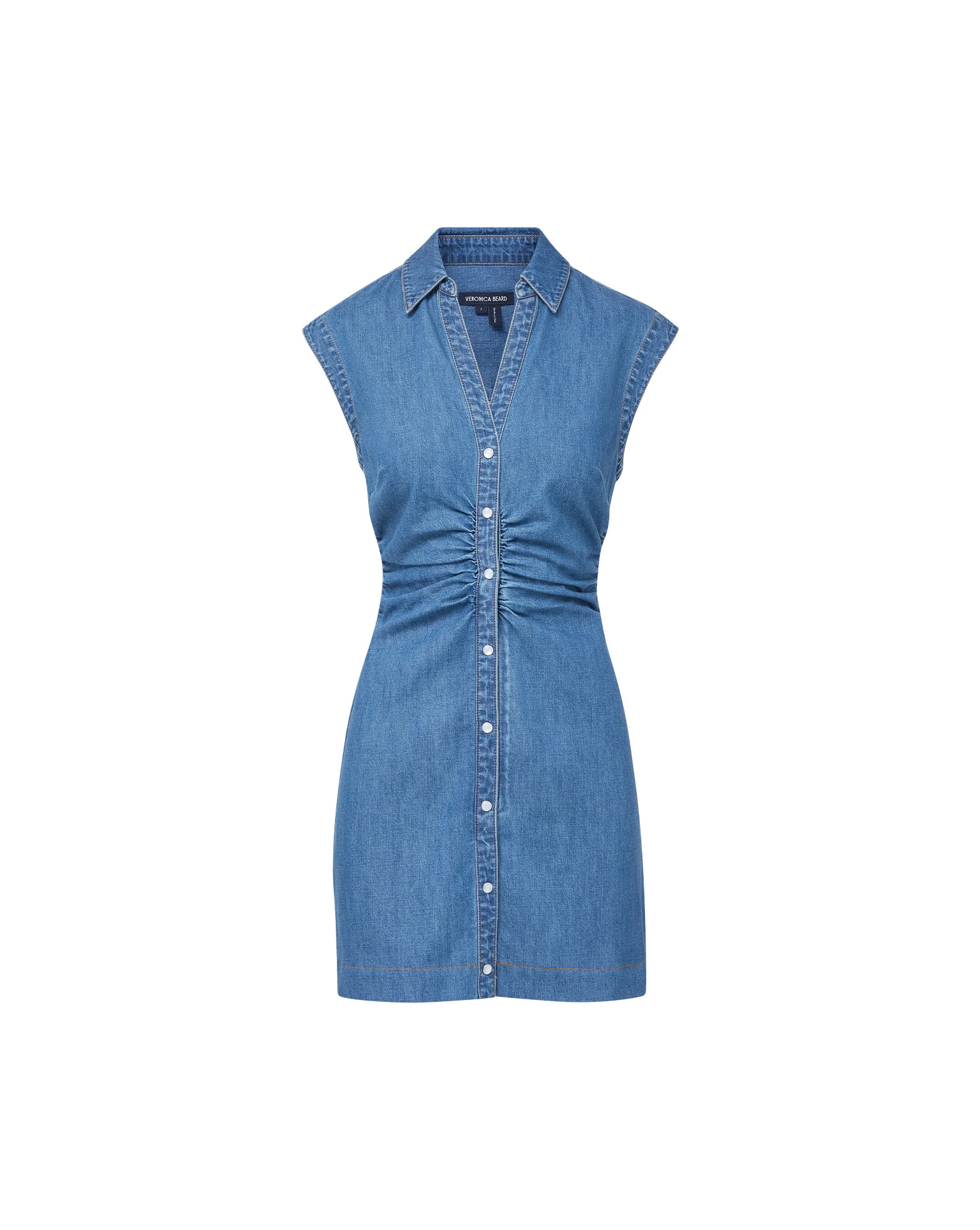 Product details A denim dress, with a VB twist. Expertly tailored from 100% cotton, the Maura button-down dress is defined by front and side ruching for a defined waist. Darting at the bust allows for a superior fit while cap sleeves, a collared V-neck, and opalescent buttons complete the look. Pair this minidress with flats for day or dress it up with neutral strappy stilettos. - 100% Cotton - Unlined - Closure: Snap buttons, a hidden front zip and a hook-and-eye closure - Turn inside out and machine wash cold. Tumble dry on low. Color transfer may occur. - Style #J25067100083SY