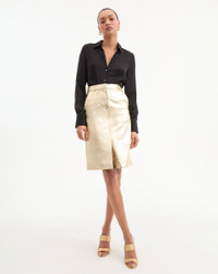 Product details A classic pencil skirt, in high-impact metallic gold leather. The ultimate statement style, this high-waisted midi features a streamlined silhouette, a fitted waist and a front slit. For a memorable matching set, pair with the Imogen jacket. - 100% Lambskin - Lining: 100% Polyester - Dry Clean Only - Style #2502LT7630602