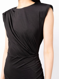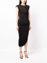 Merrith draped midi dress Highlights - Black - Stretch-design - Bodycon design - Draped detailing - Shoulder pads - Sleeveless - Round neck - Mid-calf length - Asymmetric hem Imported Composition Polyester 91%, Spandex/Elastane 9% SIZE & FIT Model measurements Height 5 ft 10 in(1.77 m) Bust/Chest 28.74 in(73 cm) Hips 35.82 in(91 cm) Waist 24.4 in(62 cm) FittingInformation Designed for a close fit throughout The internal shoulder pads offer a structured shape Made from a midweight stretch fabric, this piece offers elasticity and flexibility when worn This piece fits true to size – take your usual size Washing instructions Dry Clean Only