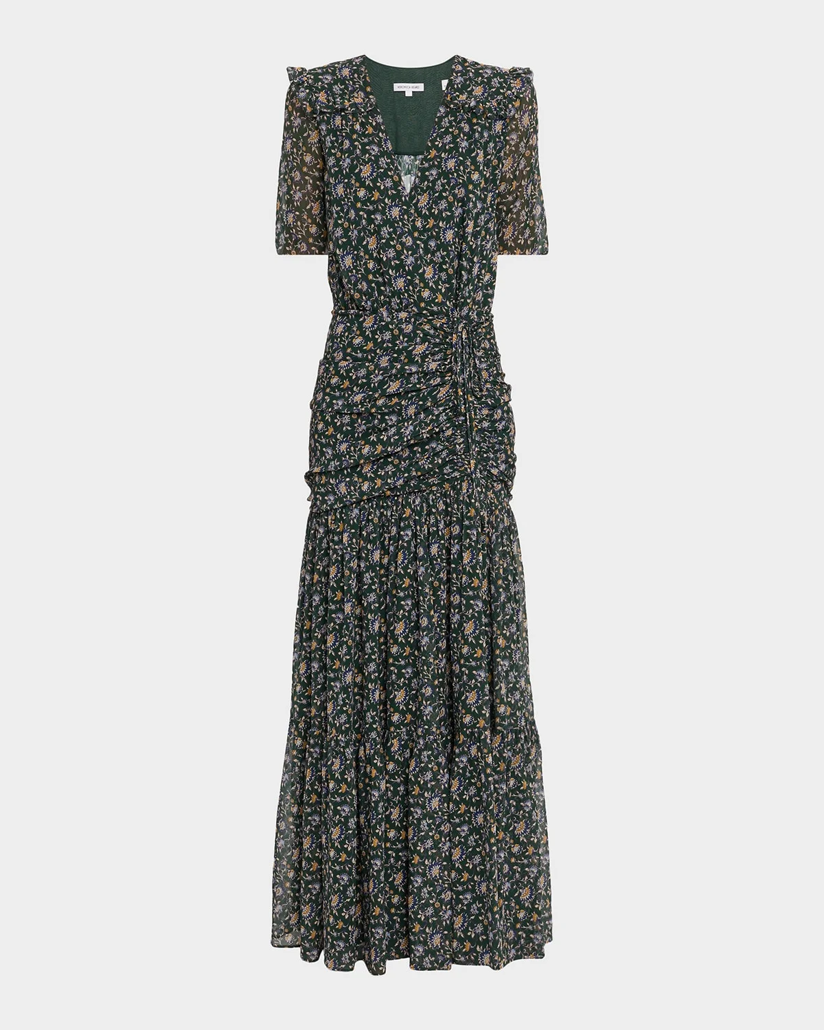 Crafted from luxurious silk, the "Mick" dress by Veronica Beard is decorated with a delicate floral print and ruching for a flattering silhouette that flows effortlessly. V neckline Short sleeves; approx. 20.3"L Fitandfalure silhouette Full length; thighhigh slit Invisible zip closure Silk Lining: Polyester Dry clean Imported