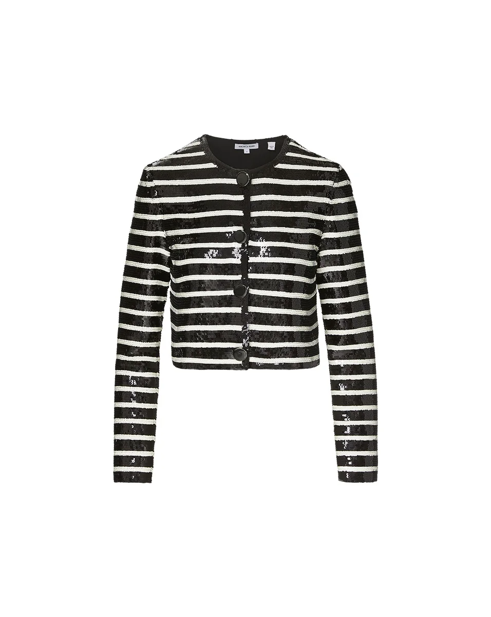 Product details A fashion-forward take on classic stripes. Expertly tailored from premium stretch cotton, the Mickey is a boxy, collarless lady jacket covered in allover sequins. Wear with jeans for a shot of daytime sparkle or style with the coordinating Cala dress for a memorable matching-set moment. - 96% Cotton, 4% Elastane - Lining: 100% Polyester - Spot clean only - Style #2411EM7311078