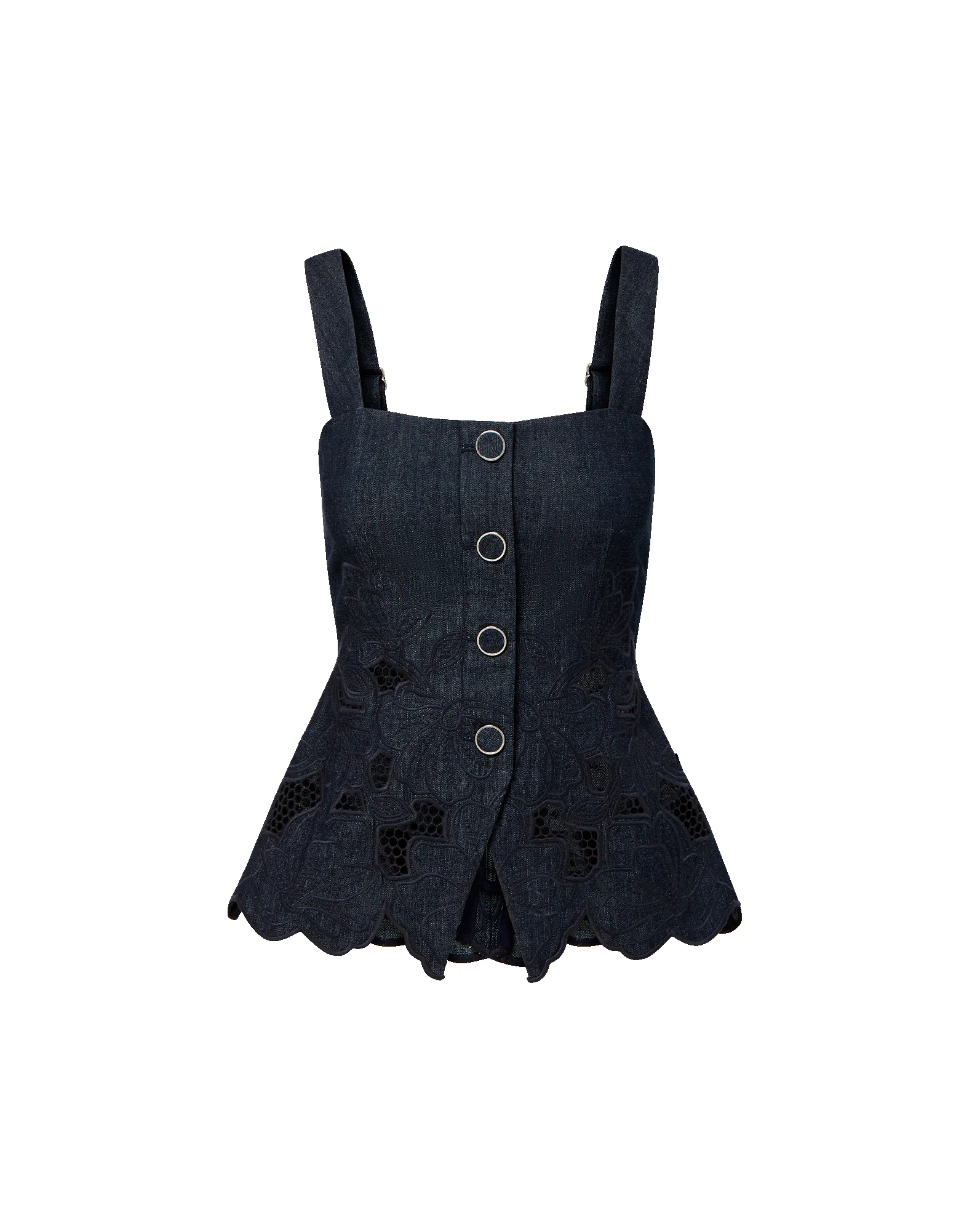 Product details Expertly tailored from premium cotton chambray, the Mirielle top features eyelet panels and a feminine petal-scalloped hem. Designed with a square neckline and adjustable straps, it’s finished with decorative self-covered buttons down the front, a split hem, and a back zipper for easy on-and-off wear. Perfect for elevating the everyday, pair this navy top with VB denim or the matching Osborne pant for a chic, coordinated set. - 100% Cotton - Lining: 100% Polyester - Dry clean only - Style #2602NV6841801