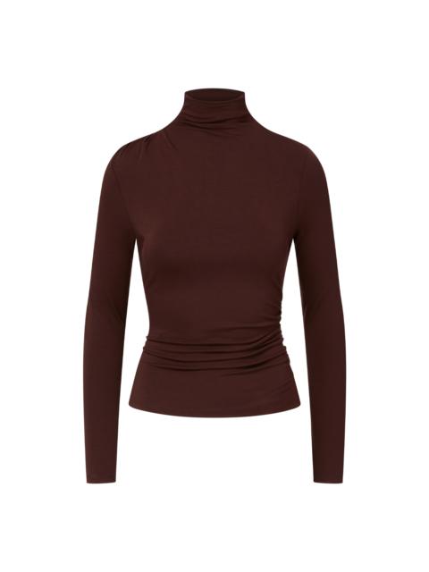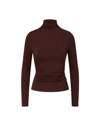 Product details An essential, elevated. Crafted from soft stretch jersey in brown, the Mylie reimagines the simple mock-neck top with subtle ruching on the sides and a contoured, body-hugging fit. This is the ultimate foundation piece—dressed up or down, perfect on its own or as a base layer. - 90% Lyocell, 10% Elastane - Machine wash cold with like colors - Style #J2510JY147S0702