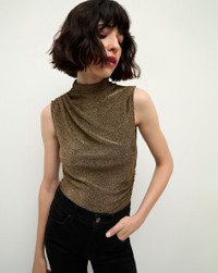 Product details An essential, elevated. Cast in a metallic gold hue, the Mylie reimagines the simple tank with a mock neck and gentle ruching on the sides. Wear on its own or as a base layer under sweaters and jackets. - 75% Polyamide, 20% Metallic Fiber, 5% Elastane - Dry clean only - Style #J2410JY93S0790